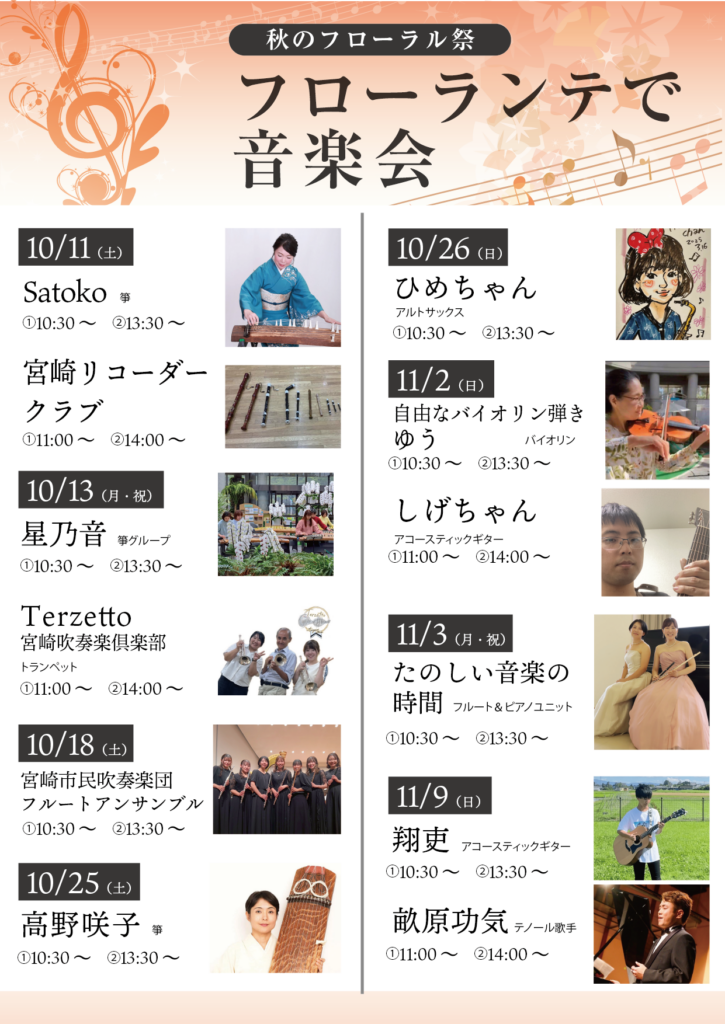 秋のフローラル祭期間中の土日祝をメインに、音楽会を開催いたします。