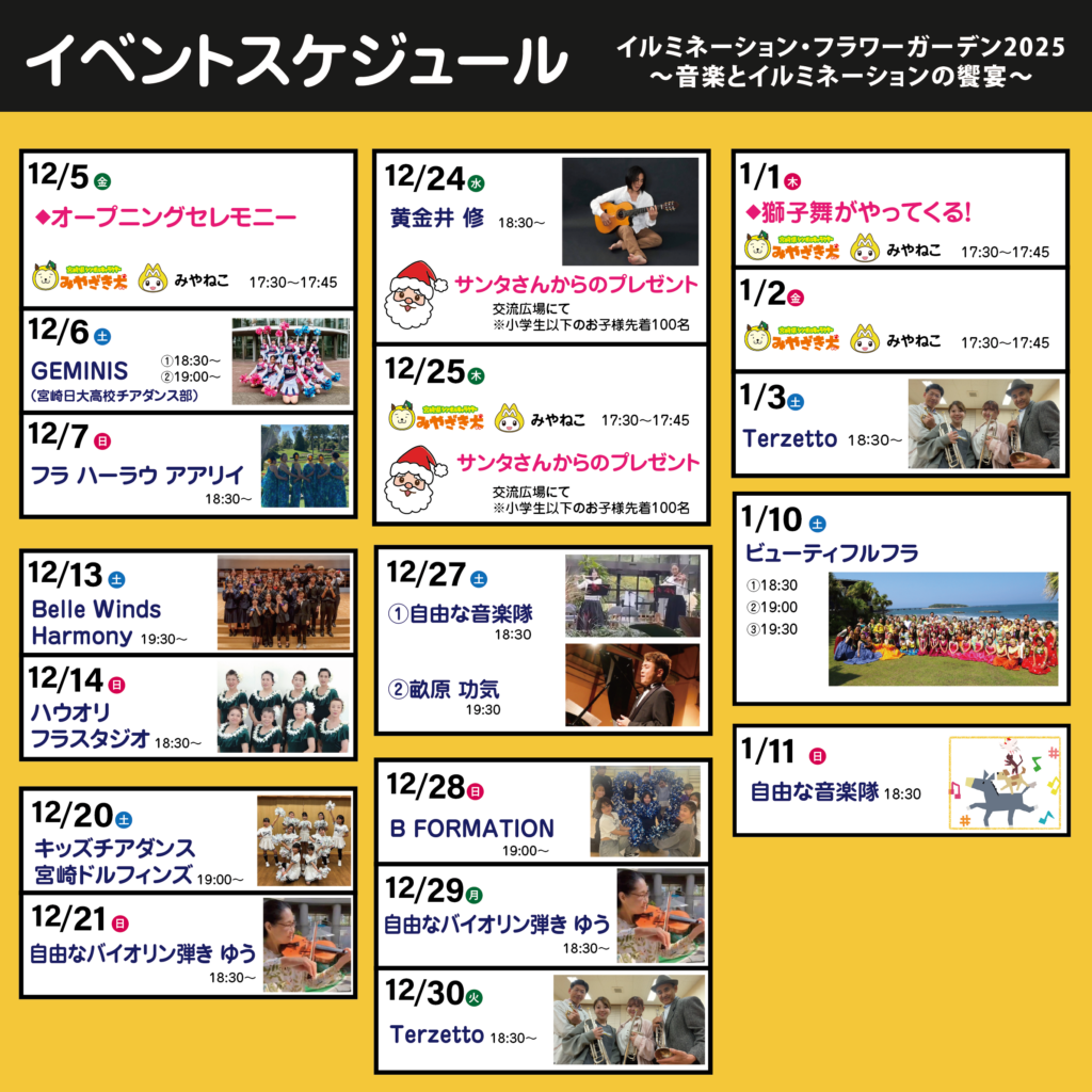 「イルミネーション・フラワーガーデン2025」期間中、週末を中心にステージイベントが行われます!