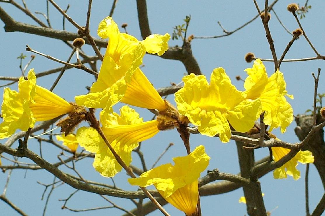 4月になると木全体がラッパ状の鮮やかな黄色い花で覆われます。また種が入っている「さや」にはやわらかい毛が生え、まるで動物のしっぽのようです。園内では駐車場や交流広場にて見ることができます。