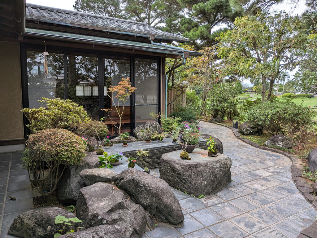 宮崎県に古くからある品種です。光沢のある濃い緑の葉を持ち、花色は濃紅色で、バラのような千重咲きです。芝生広場の東側にて見ることができます。