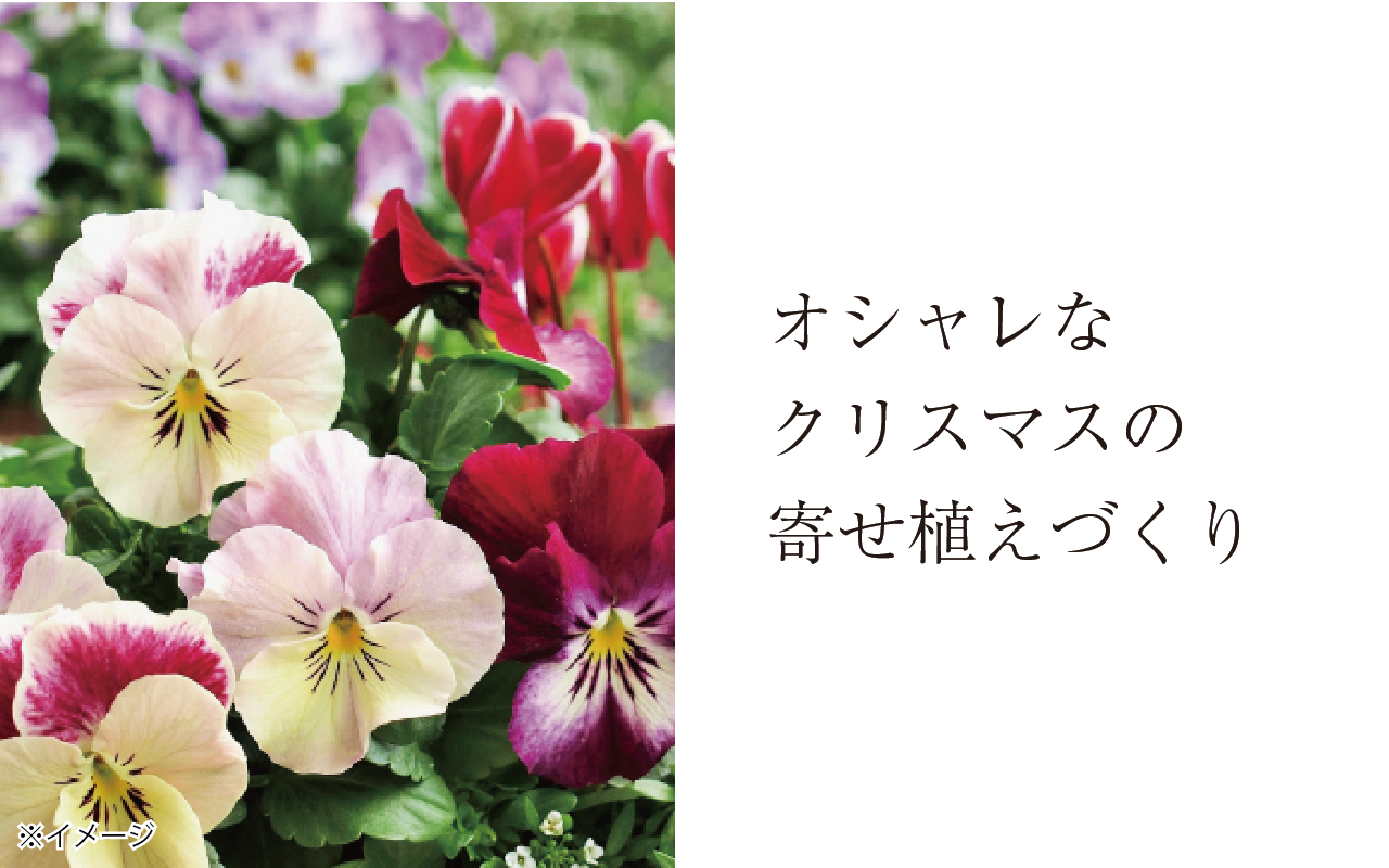 ミニシクラメンやパンジーなど寒さに強く、長く咲き続けるお花を集め、赤を基調にしたクリスマス寄せ植えをつくります。