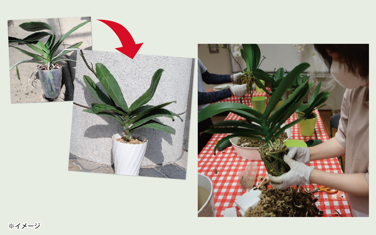 ご自宅にあるコチョウランをご持参いただき、新しい土と鉢に植え替えをします。水やりの仕方など管理方法も学べます。初心者大歓迎!株の持ち込みは1人2株まで。