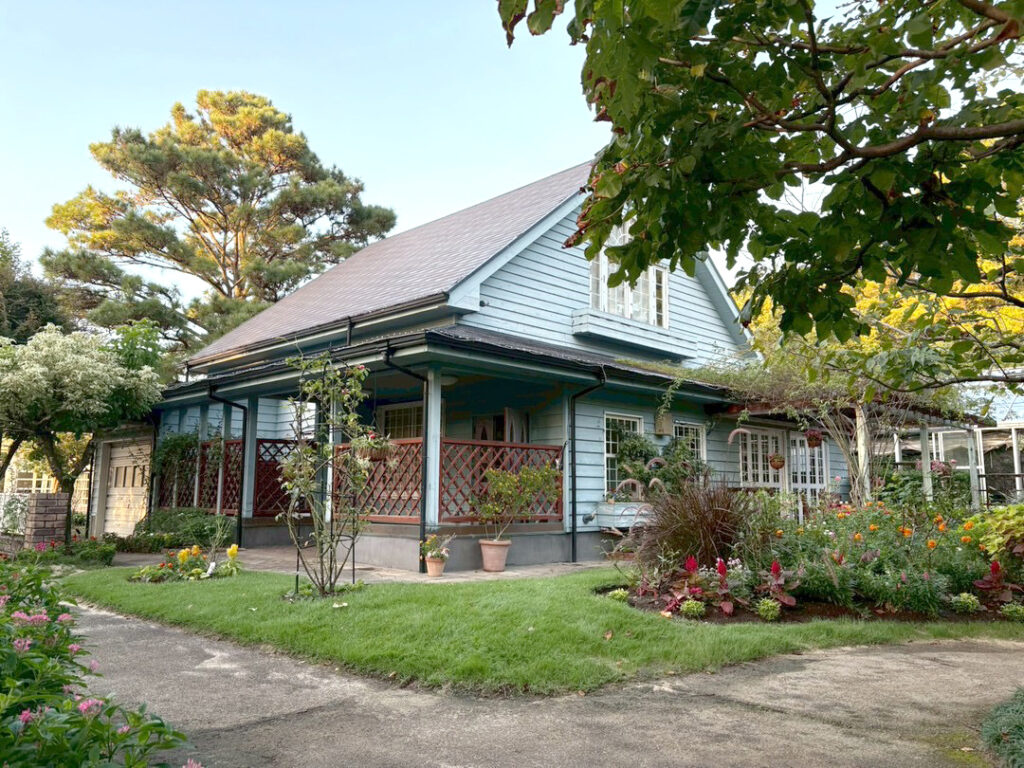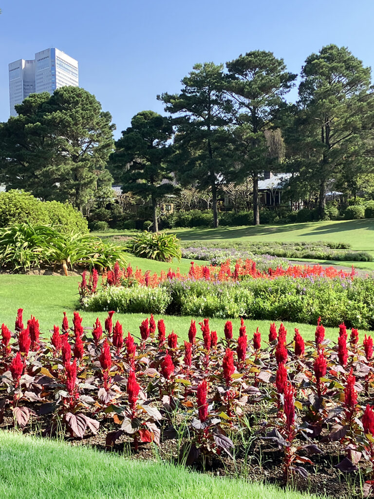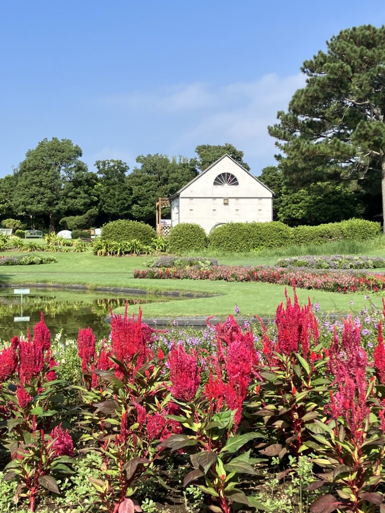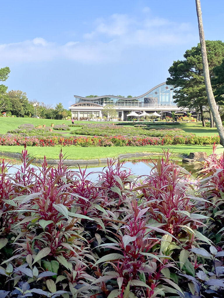園内奥の池の周辺から見ると芝生の緑と秋色の植物とのコラボレーションがお楽しみいただけます。