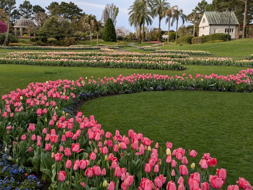 園内奥の池の周辺から見ると芝生の緑と植物とのコラボレーションがお楽しみいただけます。