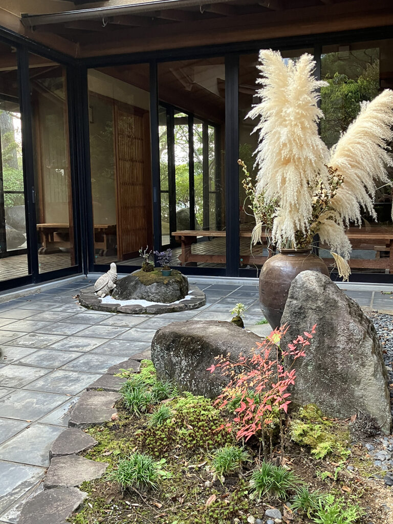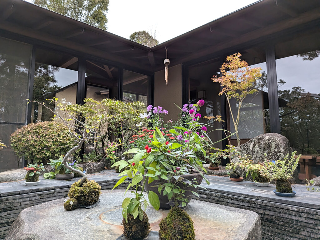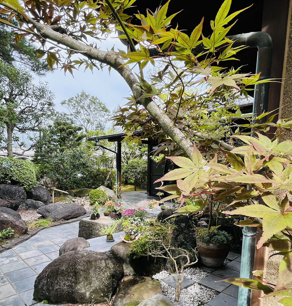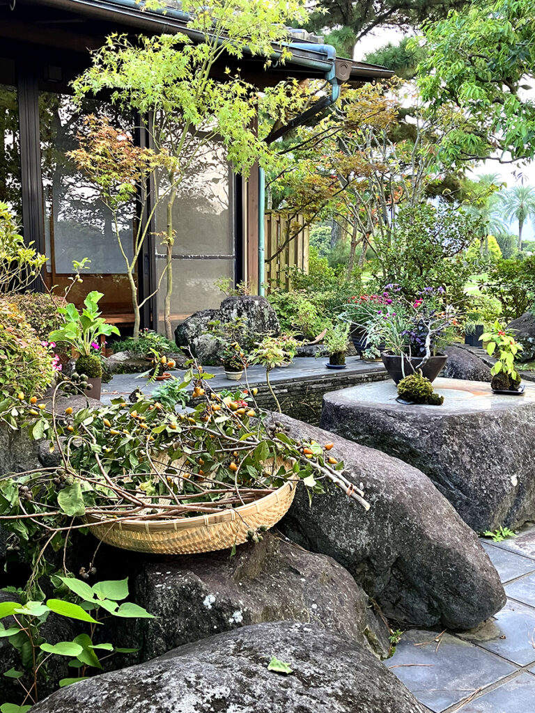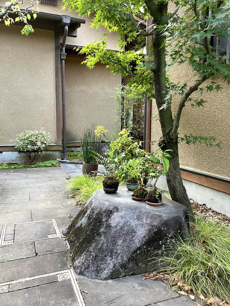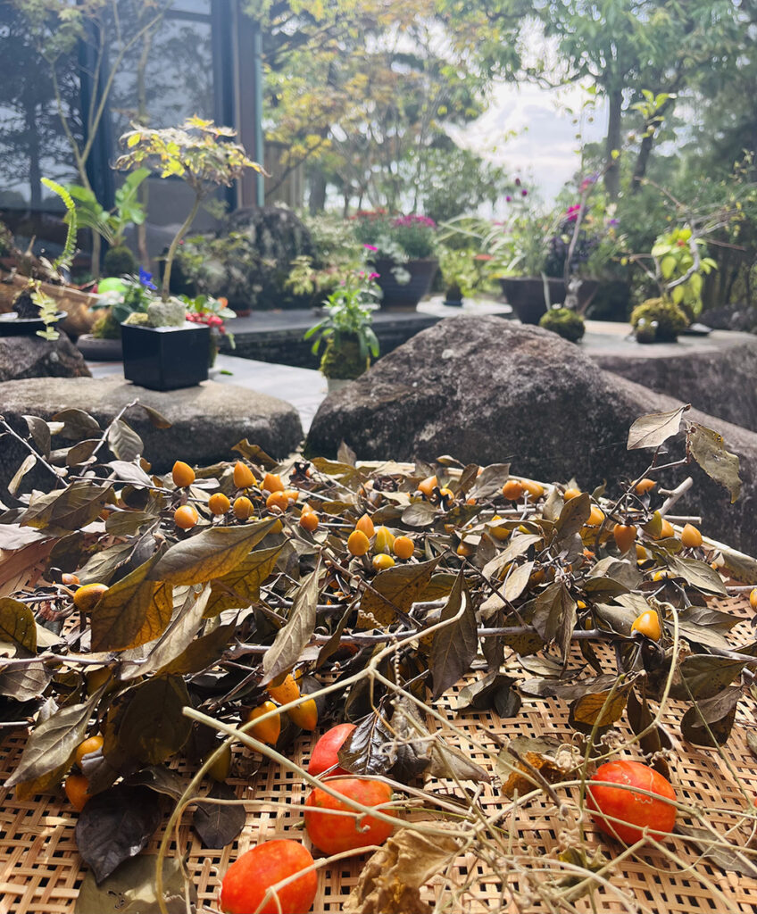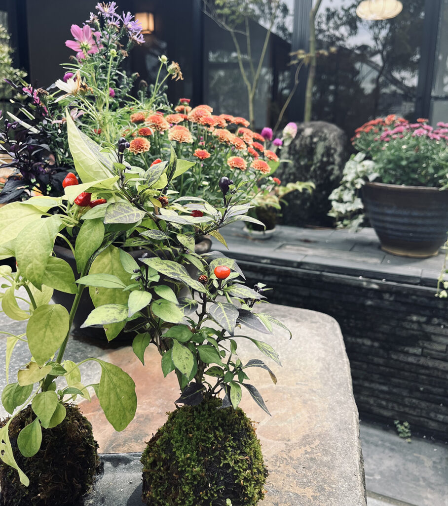 苔をはじめ緑を基調とした庭の中にある、 静かで小さな実物の苔玉、落ち着きがある寄せ植え、食の装飾品などがみどころです。