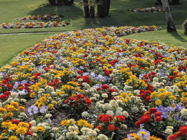 黄色やオレンジなど、八重咲きの丸形の花が次々と咲きつづけるジニア(和名:ヒャクニチソウ)を、中央芝生広場にてご覧いただけます。青々とした緑の芝生に浮かび上がる、約8,000株のジニアをお楽しみください。